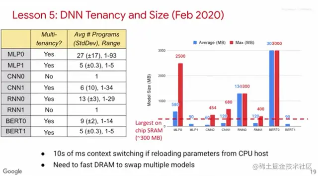 如上图所示,我们收集了8个模型的基准数据,其中6个模型涉及多租户。右方的柱状图展示了模型大小(以MB计算)。红色虚线表示单块芯片的最大SRAM,可见不少模型需要的内存远大于此,这意味着需要有存取速度极快的DRAM。部分芯片的设计思路是利用SRAM解决所有任务,但在多租户应用场景下,我们认为这很难办到。