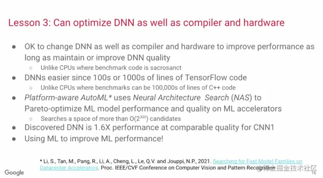 对ML工程师而言,只要可以让模型跑得更好,他们非常愿意根据硬件/编译器改进DNN模型。毕竟DNN模型不像GCC编译器,后者已成为被广泛采纳的编译器标准,不会轻易根据硬件改动。