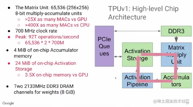TPU v1有65,000多个乘法单元,比GPU、CPU等硬件高出许多倍。尽管它的时钟频率较低,仅为700MHz,但由于其乘法单元数量巨大,且每个乘法单元可进行2个运算操作,因此TPU v1每秒可执行65,000×2×700M≈90 TeraOPS次操作。
