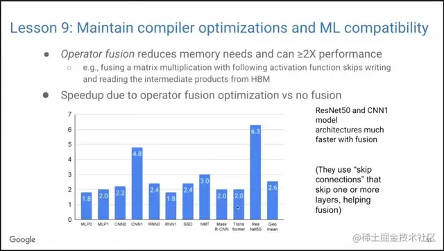 实际上的提速相当可观。其中重要的优化之一称为算子融合(Operator Fusion),如将矩阵乘法与激活函数进行融合,省略将中间结果写入HBM再读取出来的步骤。上图是我们的MLPerf基准测试结果,可见,使用算子融合平均可以带来超两倍的性能提升。