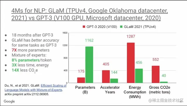 OpenAI的GPT-3问世后引起了Google所有机器学习工程师的注意,他们都卯足了劲想做得更好。18个月后,Google推出了GlaM模型,在相同的基准测试中它的表现比GPT-3更好。GlaM的参数是GPT-3的七倍,达到1.2万亿,但它的能耗却并不大,因为它利用了稀疏性。GlaM是一个MoE模型(Mixture of Experts,专家混合模型),它平时只调用每个token中的8%的参数,而密集型模型会使用100%的参数。因此,GlaM中加速器的工作时长和能耗都降低了3倍。