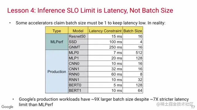 一些关于模型推理优化的论文把重点放在数据批次规模(batch size)上,认为要把batch size设置为1才能使延迟降到最低。然而,通过MLPerf基准数据可见,Google的生产模型在batch size相当大的情况下也能实现低延迟,这可能是因为这些模型是基于TPU开发,因此更加高效。