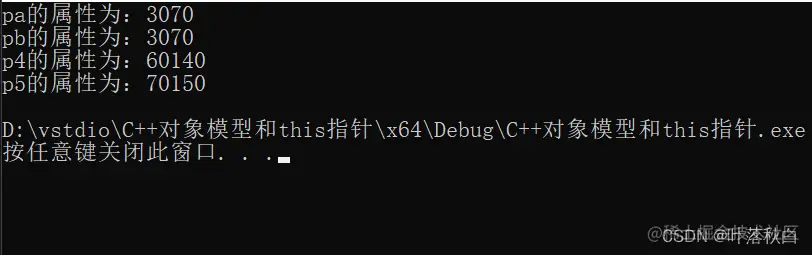 定义Person类,声明两个整型属性,我们都知道在类内定义的函数为成员函数或者方法;这个成员函数的返回值为Person类型,意为返回的话会自动调用编译器提供的拷贝构造函数,这个在前面的文章已经提到过,这里注意函数名不要自定义了,就写operator+,英文意思就是’+‘操作,这样定义符合编译器规范,可以使用简化版的运算,然后参数也是Person类型的,这是因为我们的目的就是要实现自定义类型的运算;该函数的实现也很简单,就是将各属性相加后的结果返回给新的对象;主函数中pa和pb的两个属性均会相等,pa的调用是重载的本质调用,pb的则是简化的调用,看一下运行结果: