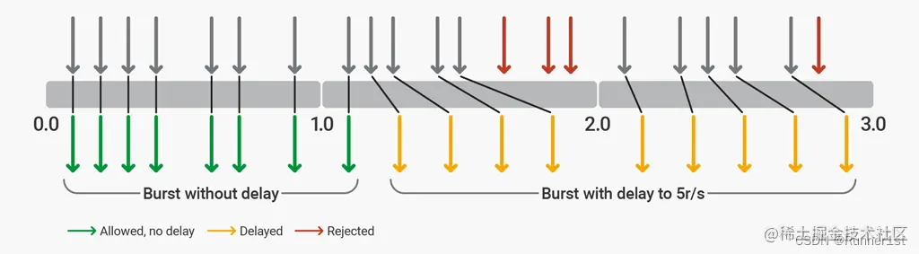 - 可以通过Nginx的 delay=? 配置来实现。这个配置表示在超出限定速率的请求中,超过多少个请求之后需要被延时处理,没有超过delay值的请求,无需等待。nodelay其实是delay的一种特殊情况,表示所有请求都无需等待,相当于delay的值等于burst。