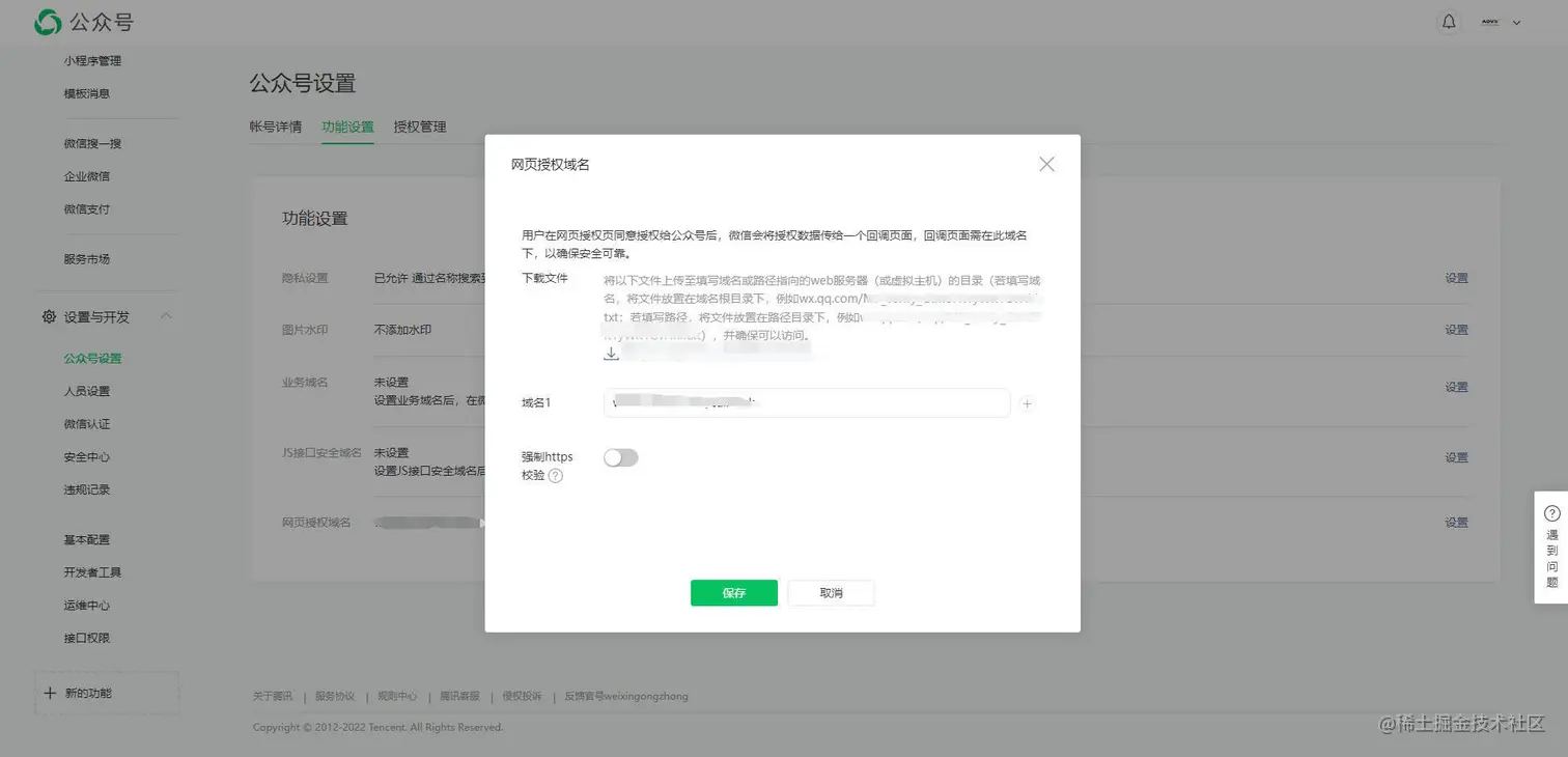 在【设置与开发】-【公众号设置】-【功能设置】中,设置网页授权域名,用户回调获取用户信息。注意:不能使用ip、端口,不需要http/https;