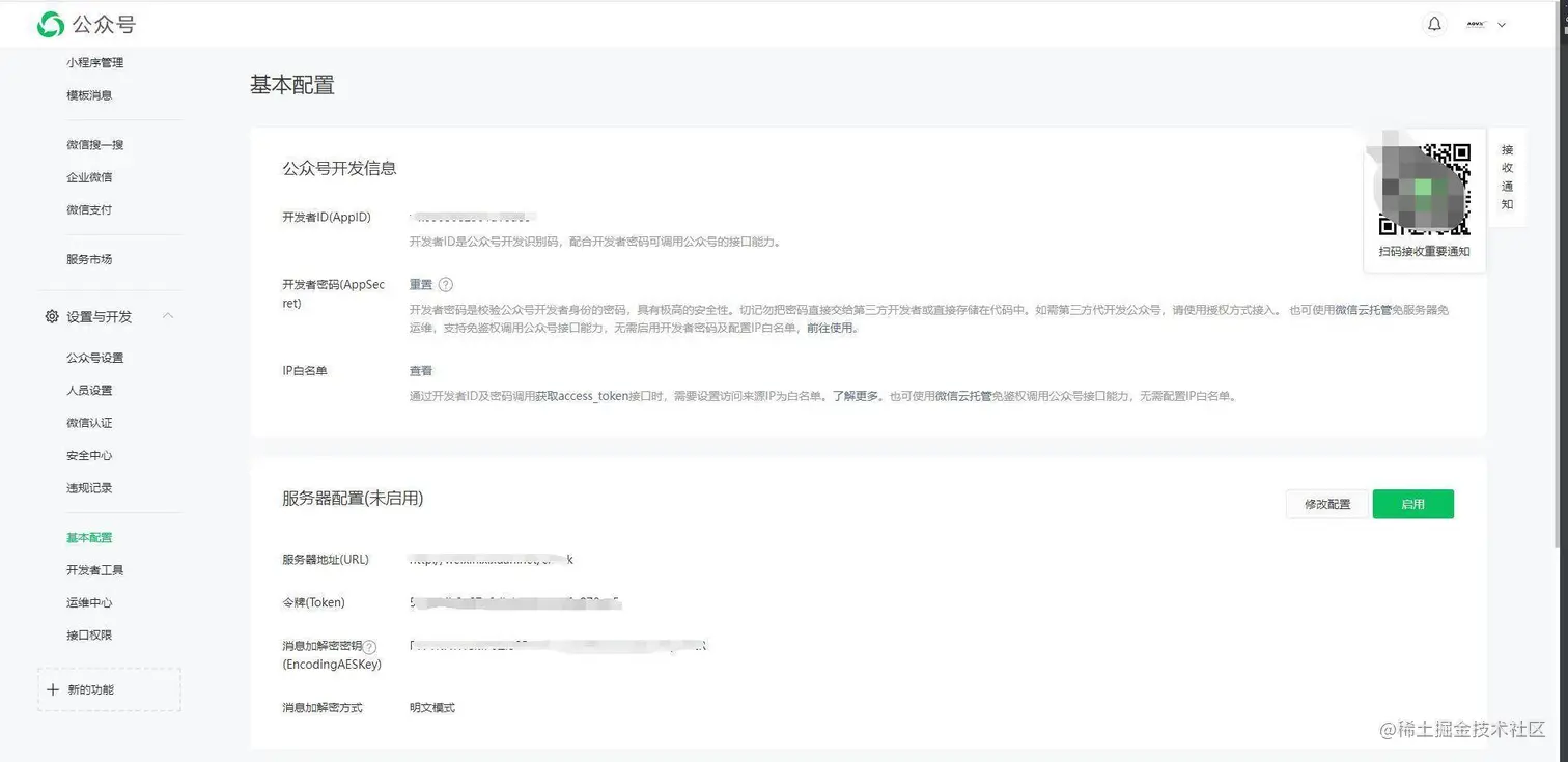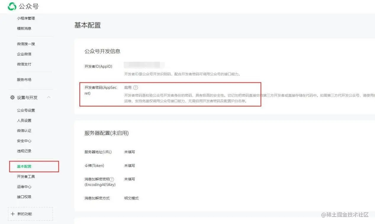 1)在微信公众号的【设置与开发】-【基本配置】中,启用开发者密码;