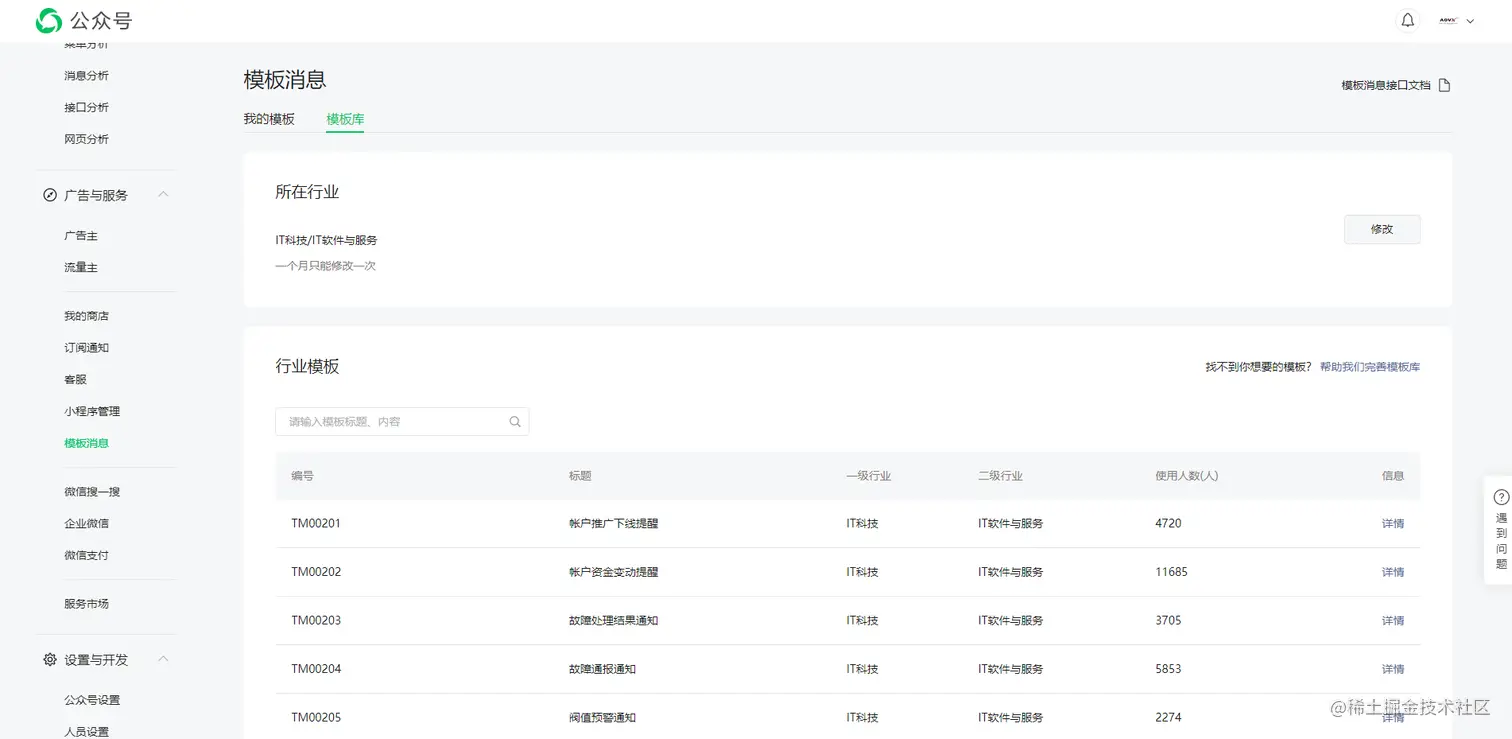 4)在【广告与服务】-【模板消息】中,申请模板消息的权限,审核通过后即可在模板库中添加告警推送的消息模板。