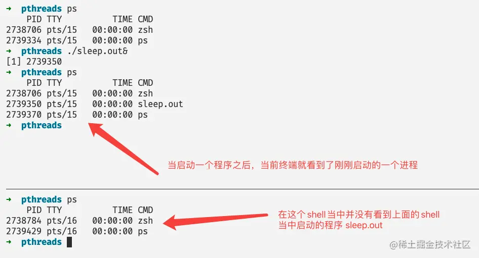 - 但是我们在下面同一个用户的不同终端就不能够看到在上面一个终端启动的程序。