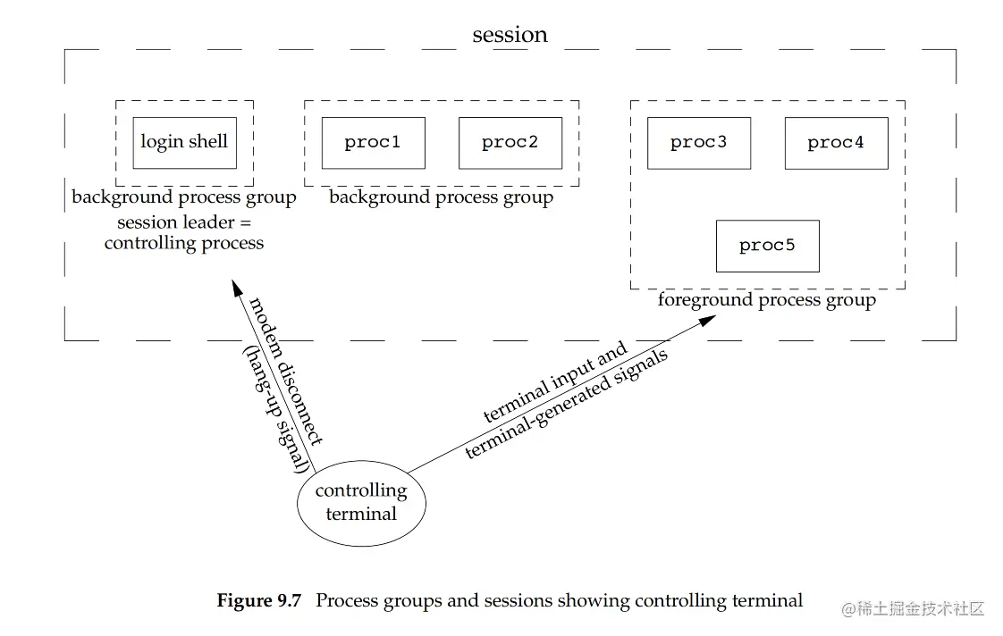 一个更具体的描述一个 shell 中 session leader 和其他进程的关系如下图所示(图中最左方就是 session leader 进程):