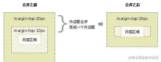 对于两个嵌套关系的块元素,如果父元素没有上内边距及边框,则父元素的上外边距会与子元素的上外边距发生合并,合并后的外边距为两者中的较大者,即使父元素的上外边距为0,也会发生合并。
