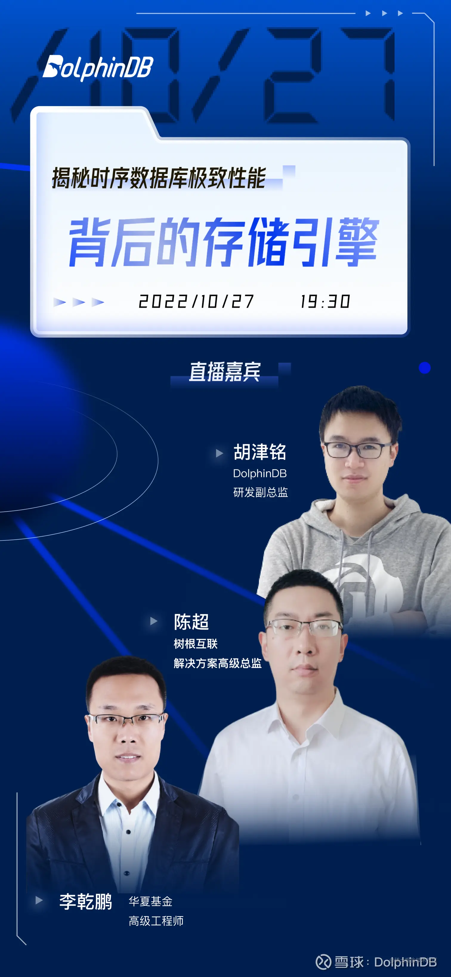 本次直播时间为 2022年10月27日(周四)19:30。我们邀请到了「树根互联」解决方案高级总监陈超、「华夏基金」高级工程师李乾鹏以及「DolphinDB」研发副总监胡津铭,一同与大家探讨时序数据库极致性能背后的存储引擎。