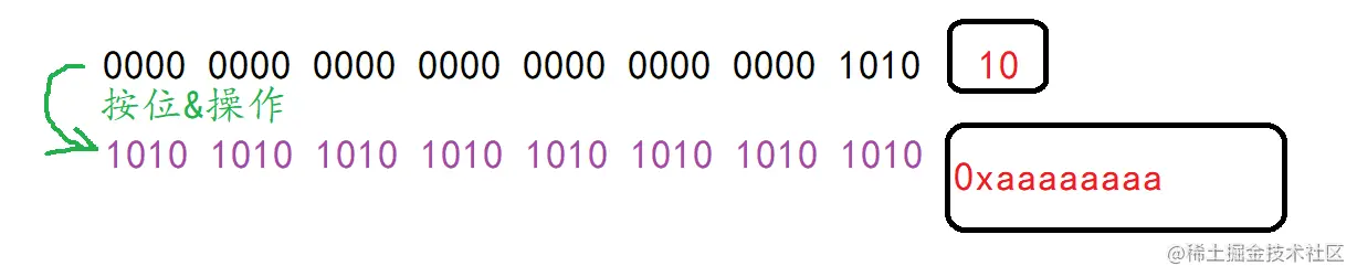 n & 0xaaaaaaaa 规律⇢全部与上二进制的偶数位、注-①字节等于③②bit