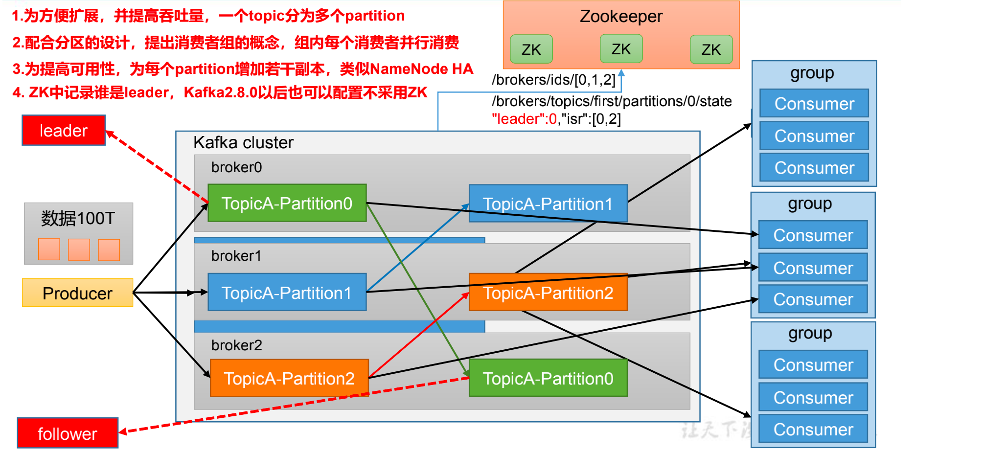 Leader:每个分区多个副本的“主” ,生产者发送数据的对象,以及消费者消费数据的对象都是 Leader。