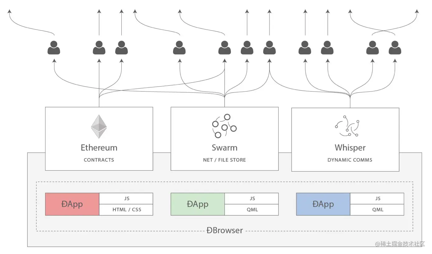 web3.js 库还包含一个名为 Swarm 的P2P存储网络接口和一个称为 Whisper 的P2P消息传递服务。通过使用这三个组件,开发人员可以使用完整的应用程序开发套件来构建Web3 DApps: