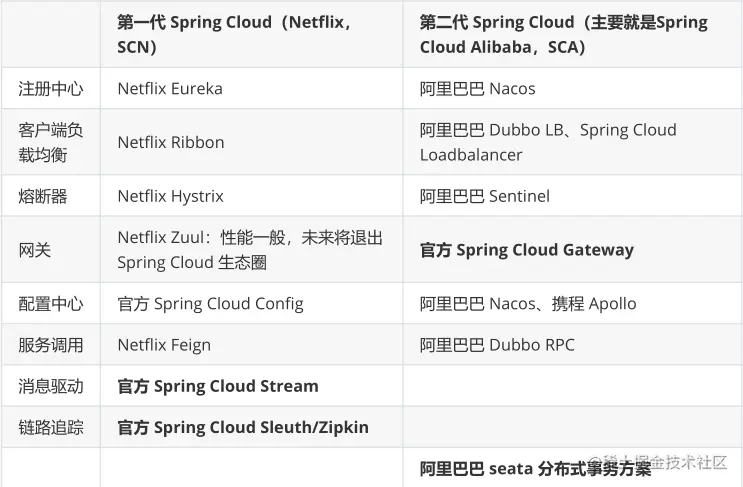 Spring Cloud 生态圈中的组件,按照发展可以分为第一代 Spring Cloud组件和第二代 SpringCloud组件。