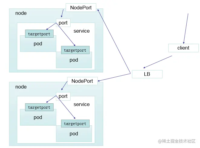 Cluster 外部可以通过 <NodeIP>:<NodePort> 访问 Service。