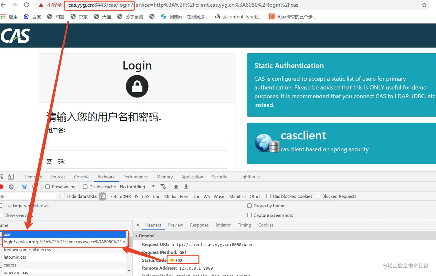 在我们输入client.cas.yyg.cn:8080/user地址后,在浏览器控制台,我们可以发现访问该接口时产生了一个302重定向,会从/user接口重定向到了CAS Server的/cas/login登录界面,这里需要我们输入之前在CAS Server的application.properties配置文件中配置的用户名和密码,yyg:123