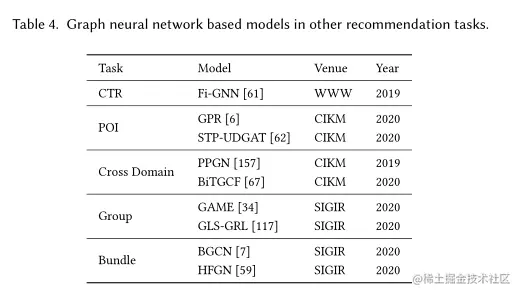 术研究中,大量工作表明,基于GNN的模型优于以往的方法,GNN许多变体被提出并应用于各种推荐任务,如基于会话的推荐、兴趣点(Points-of-interest, POI)推荐、群体推荐和捆绑推荐。
