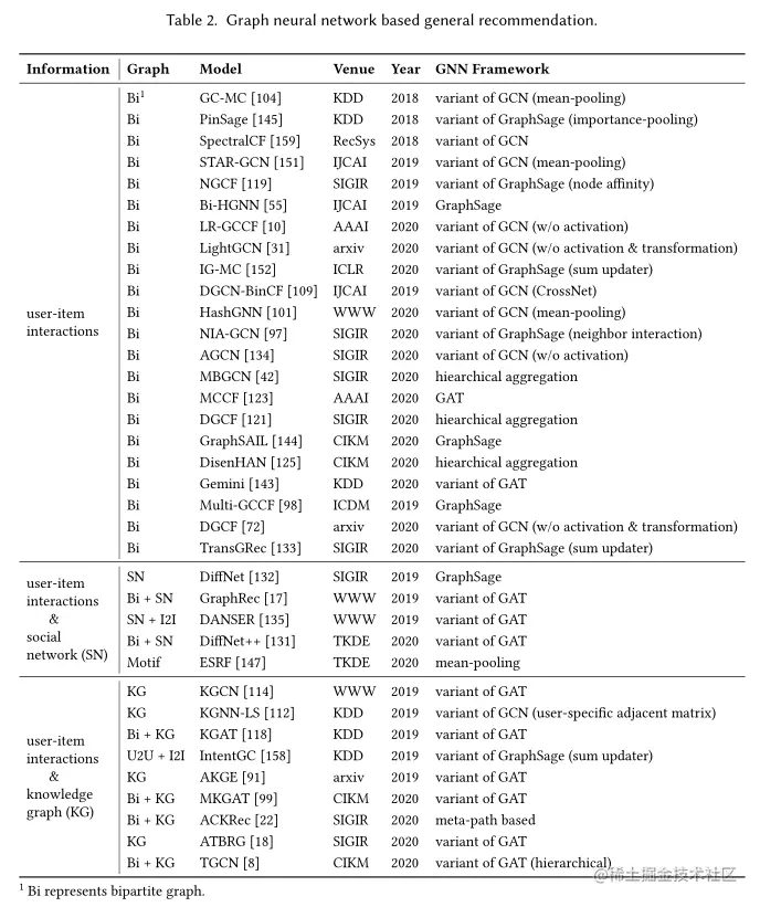 新的分类法:对现有的基于图神经网络的推荐模型分类。根据所处理的任务,分为一般推荐和序列推荐。进一步将这两个任务中已有的模型分为三类:仅有交互信息的模型、社交网络增强的模型和知识图谱增强的模型。