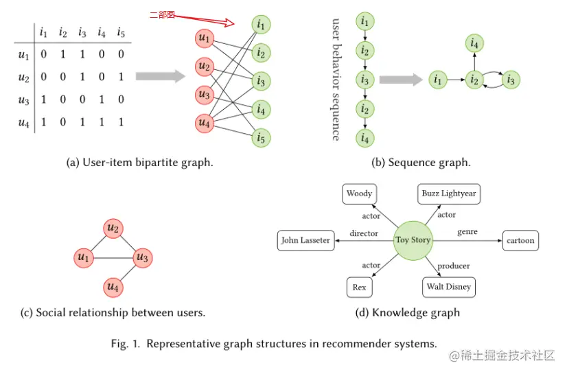 **最直观且核心的原因是:**GNN技术已被证明在各个领域的图数据表示学习中具有强大的能力,推荐中的大多数数据本质上都是图结构,如图1所示。
