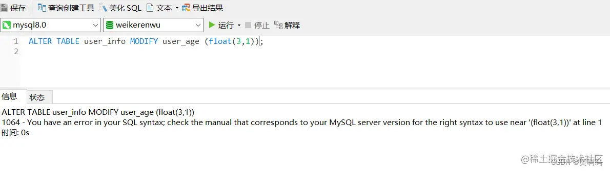 3、修改字段的数据类型,将user_age的数据类型设置为float(3,1)