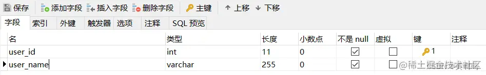 如上,我们创建了一个叫做user_info的表, 里面有两个字段,一个是 user_id ,它是 int 类型,另一个 user_name 字段是varchar(255)类型。这两个字段都不为空,且 user_id 是递增的,而其中的not null表示非空,切记语句最后要加 ; 【千万要记住】AUTO_INCREMENT代表主键自动增长。有刚入门的同学说什么是主键?>>文章后边我会单纯讲述,别着急。