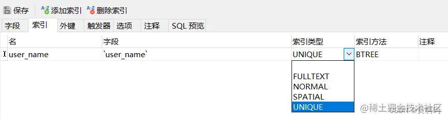 编辑 我们还可对user_name字段进行索引,索引类型为