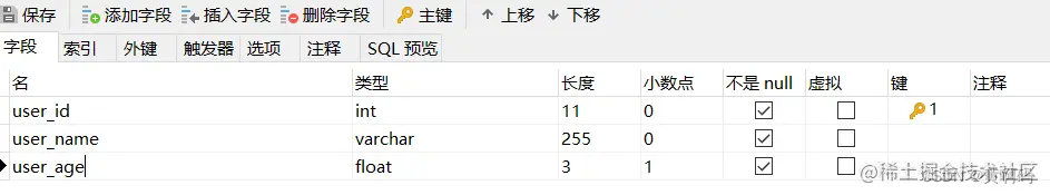 1、添加字段,比如我在数据表中添加一个 age 字段,类型为int(11)