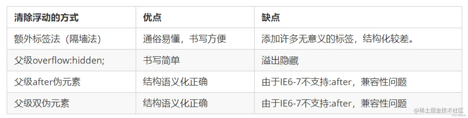 由于父级盒子很多情况下,不方便给高度,但是子盒子浮动又不占有位置,最后父级盒子高度为 0 时,就会影响下面的标准流盒子。
