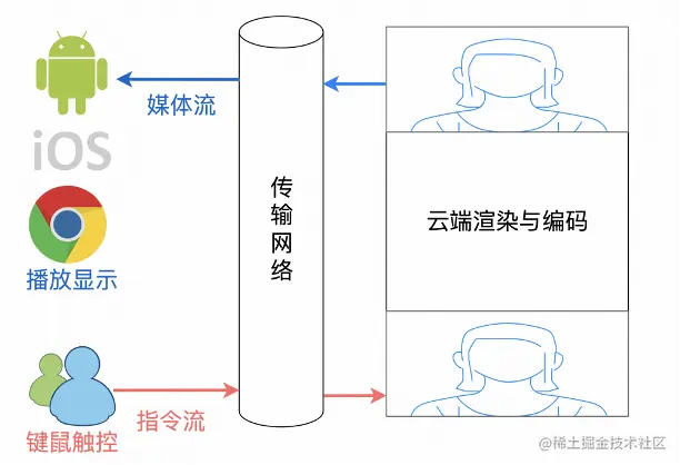 “串流” 是实现云游戏的关键方式,通过数据中心将游戏渲染场景转换成视频流,再通过传输网络推送到用户终端显示。