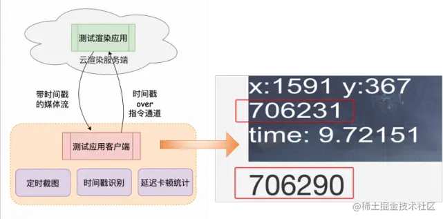 右侧为工具运行效果,图上示例中的时间延迟为706290(客户端) - 706231(服务端) = 59 ms。通过OCR识别和长时间大数据量的测试,可获取云渲染串流时延的统计结果。