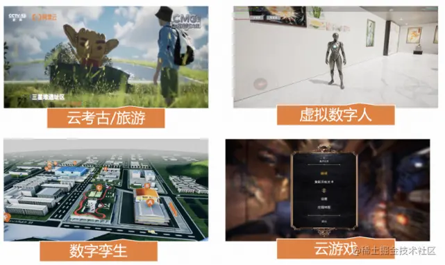 云渲染「串流」技术通常应用在云上考古、云旅游、虚拟数字人直播、智慧城市数字孪生应用和云游戏的场景。