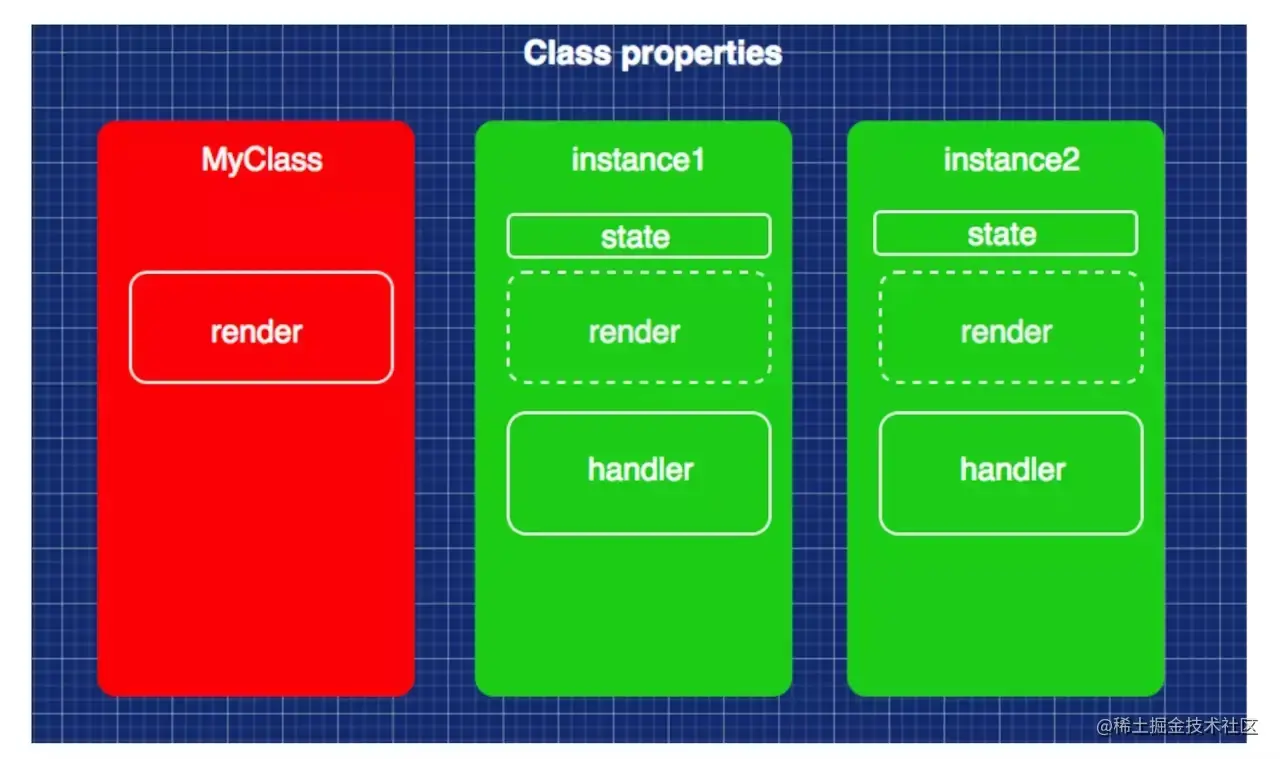 注: 图中,虚线框面积代表引用函数所节省的内存,实线框的面积代表消耗的内存。 图一:使用箭头函数做this绑定。只有render函数定义在原型对象上,由所有实例对象共享。其他内存消耗都是基于每个实例上的。 图二:在构造函数中做this绑定。render,handler都定义在原型对象上,实例上的handler实线框代表使用bind生成的函数所消耗的内存大小。