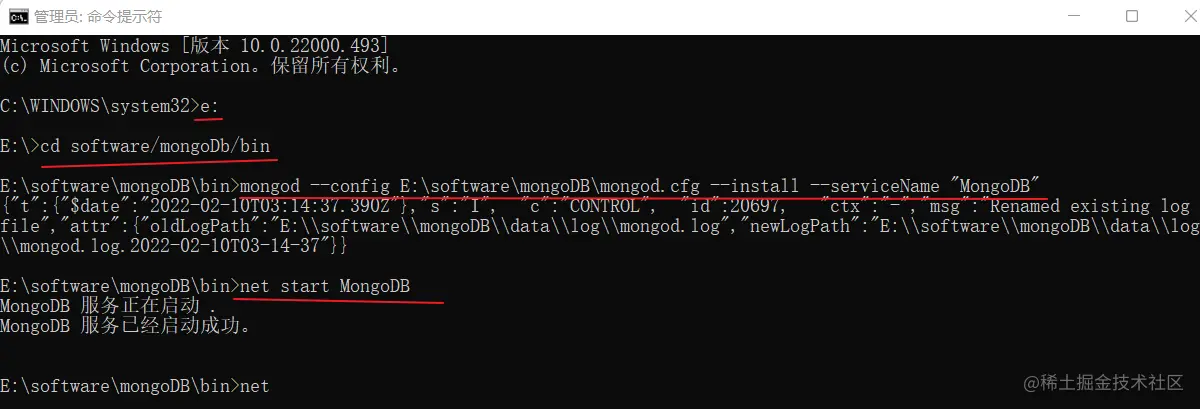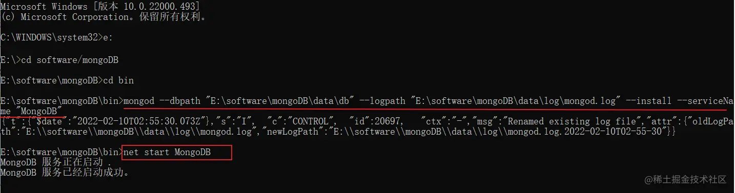 mongod --dbpath "E:\software\mongoDB\data\db" --logpath "E:\software\mongoDB\data\log\mongod.log" --install --serviceName "MongoDB"