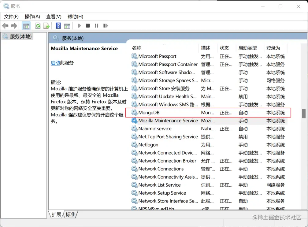 在键盘上按 “WIN+R”,输入“services.msc”指令确定,打开服务后,找到MongoDB,如下图表示已经成功!