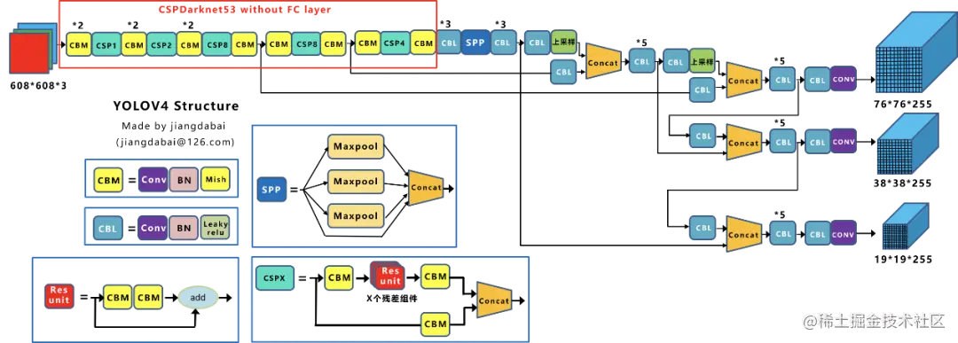 从算法结构方面看,YOLOv4由三部分组成:Backbone层提取特征,Neck层提取一些更复杂的特征,最后由Head层计算预测输出。