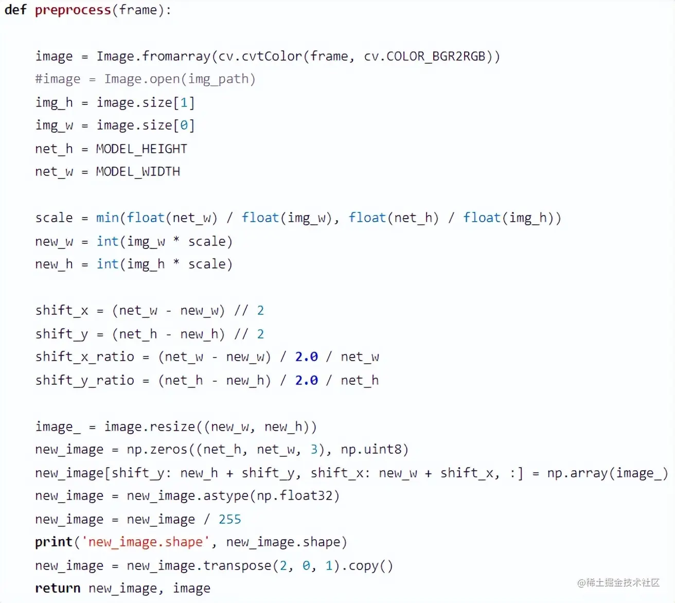 在预处理阶段,主要将opencv读到的图像转换成符合模型输入标准格式和尺寸的图像(源码如下图所示,完整版代码请查看文末链接)。