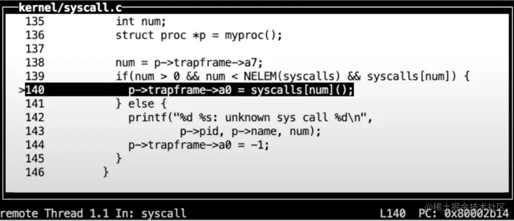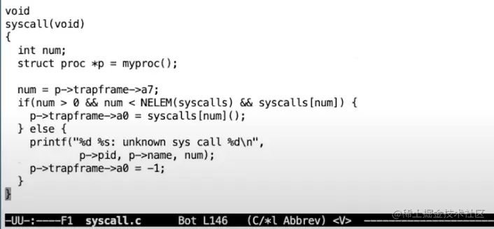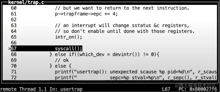 现在代码运行在C中,所以代码更加容易理解。在usertrap这个C函数中,我们执行了一个叫做syscall的函数。