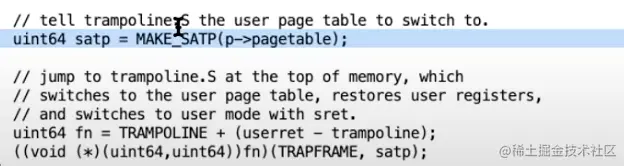 接下来,我们根据user page table地址生成相应的SATP值,这样我们在返回到用户空间的时候才能完成page table的切换。实际上,我们会在汇编代码trampoline中完成page table的切换,并且也只能在trampoline中完成切换,因为只有trampoline中代码是同时在用户和内核空间中映射。但是我们现在还没有在trampoline代码中,我们现在还在一个普通的C函数中,所以这里我们将page table指针准备好,并将这个指针作为第二个参数传递给汇编代码,这个参数会出现在a1寄存器。