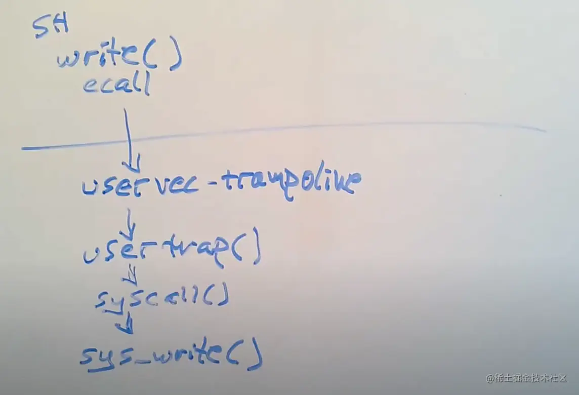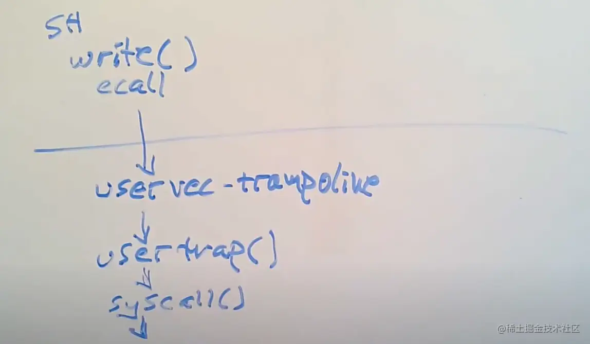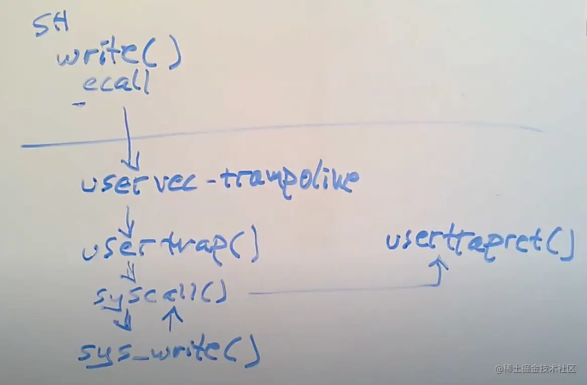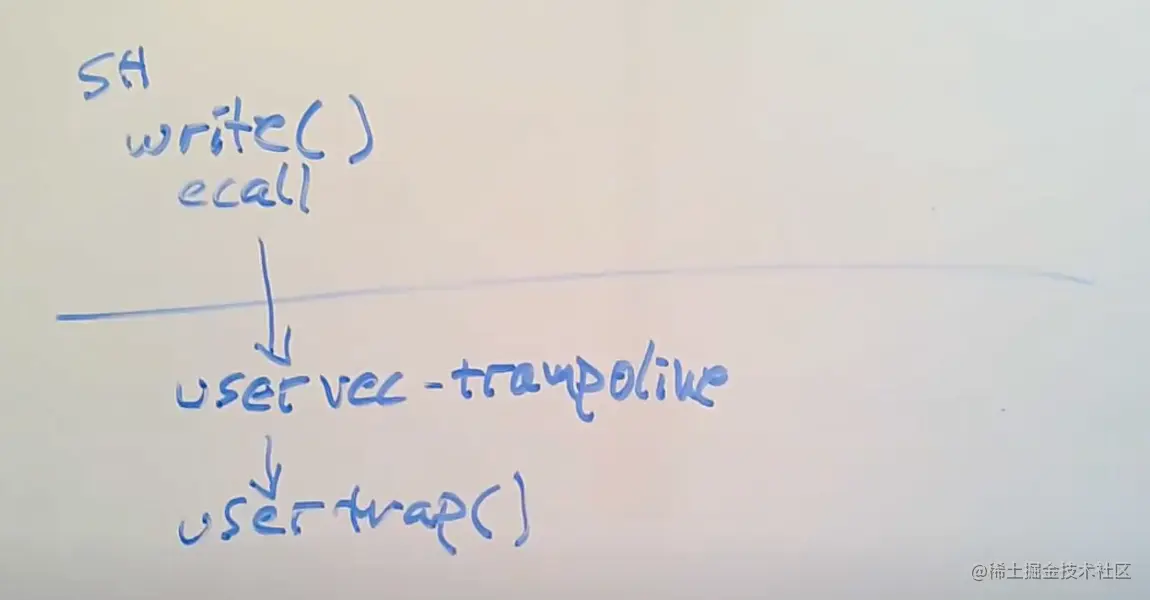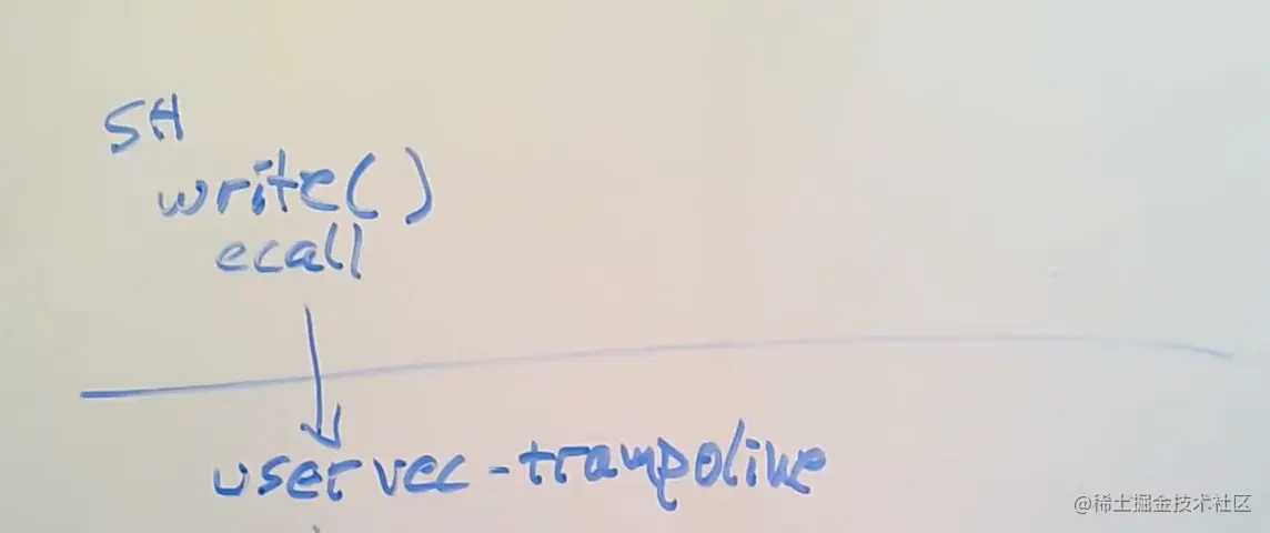 从Shell的角度来说,这就是个Shell代码中的C函数调用,但是实际上,write通过执行ECALL指令来执行系统调用。ECALL指令会切换到具有supervisor mode的内核中。在这个过程中,内核中执行的第一个指令是一个由汇编语言写的函数,叫做uservec。这个函数是内核代码trampoline.s文件的一部分。所以执行的第一个代码就是这个uservec汇编函数。