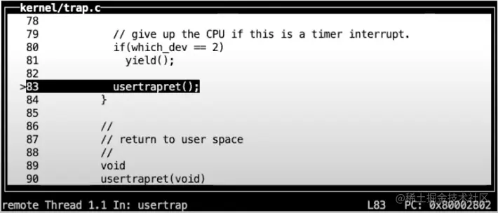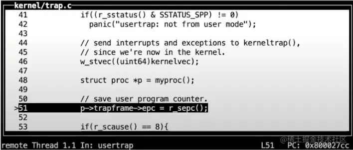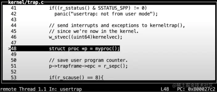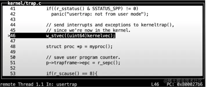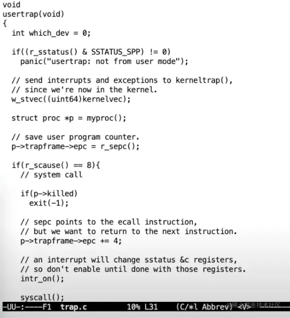 之后,在这个汇编函数中,代码执行跳转到了由C语言实现的函数usertrap中,这个函数在trap.c中。