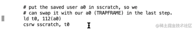 在uservec函数中,第一件事情就是交换SSRATCH和a0寄存器。而这里,我们将SSCRATCH寄存器恢复成保存好的用户的a0寄存器。在这里a0是trapframe的地址,因为C代码usertrapret函数中将trapframe地址作为第一个参数传递过来了。112是a0寄存器在trapframe中的位置。(注,这里有点绕,本质就是通过当前的a0寄存器找出存在trapframe中的a0寄存器)我们先将这个地址里的数值保存在t0寄存器中,之后再将t0寄存器的数值保存在SSCRATCH寄存器中。