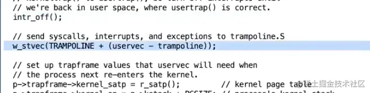 在下一行我们设置了STVEC寄存器指向trampoline代码,在那里最终会执行sret指令返回到用户空间。位于trampoline代码最后的sret指令会重新打开中断。这样,即使我们刚刚关闭了中断,当我们在执行用户代码时中断是打开的。