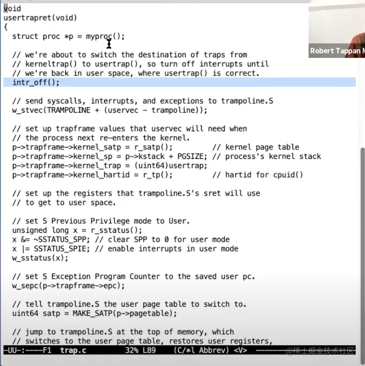 Robert教授:sret打开了中断。所以在supervisor mode中的最后一个指令,我们会重新打开中断。用户程序可能会运行很长时间,最好是能在这段时间响应例如磁盘中断。