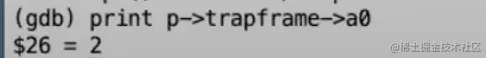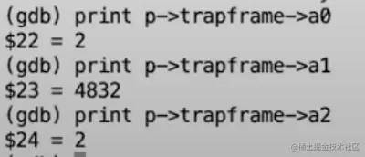 这里向trapframe中的a0赋值的原因是:所有的系统调用都有一个返回值,比如write会返回实际写入的字节数,而RISC-V上的C代码的习惯是函数的返回值存储于寄存器a0,所以为了模拟函数的返回,我们将返回值存储在trapframe的a0中。之后,当我们返回到用户空间,trapframe中的a0槽位的数值会写到实际的a0寄存器,Shell会认为a0寄存器中的数值是write系统调用的返回值。执行完这一行代码之后,我们打印这里trapframe中a0的值,可以看到输出2。