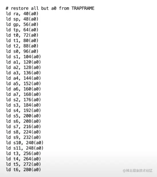 接下来会执行一系列加载trapframe中的寄存器到指定寄存器内容,并在这个过程中切换为kernel pagetable,并进入到执行内核中的C代码