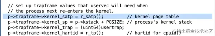 - 从tp寄存器中读取当前的CPU核编号,并存储在trapframe中,这样trampoline代码才能恢复这个数字,因为用户代码可能会修改这个数字