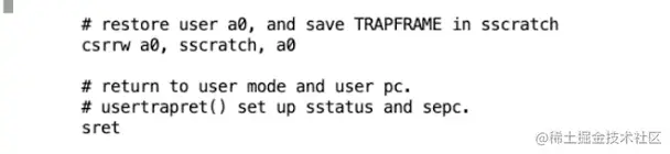 最终,在这个汇编函数中会调用机器指令返回到用户空间,并且恢复ECALL之后的用户程序的执行。