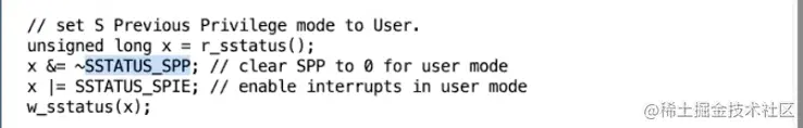 接下来我们要设置SSTATUS寄存器,这是一个控制寄存器。这个寄存器的SPP bit位控制了sret指令的行为,该bit为0表示下次执行sret的时候,我们想要返回user mode而不是supervisor mode。这个寄存器的SPIE bit位控制了,在执行完sret之后,是否打开中断。因为我们在返回到用户空间之后,我们的确希望打开中断,所以这里将SPIE bit位设置为1。修改完这些bit位之后,我们会把新的值写回到SSTATUS寄存器。