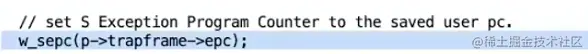 接下来我们要保存用户程序计数器,它仍然保存在SEPC寄存器中,但是可能发生这种情况:当程序还在内核中执行时,我们可能切换到另一个进程,并进入到那个程序的用户空间,然后那个进程可能再调用一个系统调用进而导致SEPC寄存器的内容被覆盖。所以,我们需要保存当前进程的SEPC寄存器到一个与该进程关联的内存中,这样这个数据才不会被覆盖。这里我们使用trapframe来保存这个程序计数器。